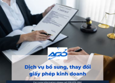 ACO cung cấp dịch vụ bổ sung, thay đổi giấy phép kinh doanh nhanh chóng, trọn gói. Hỗ trợ tư vấn, soạn hồ sơ và làm việc với cơ quan Nhà nước.